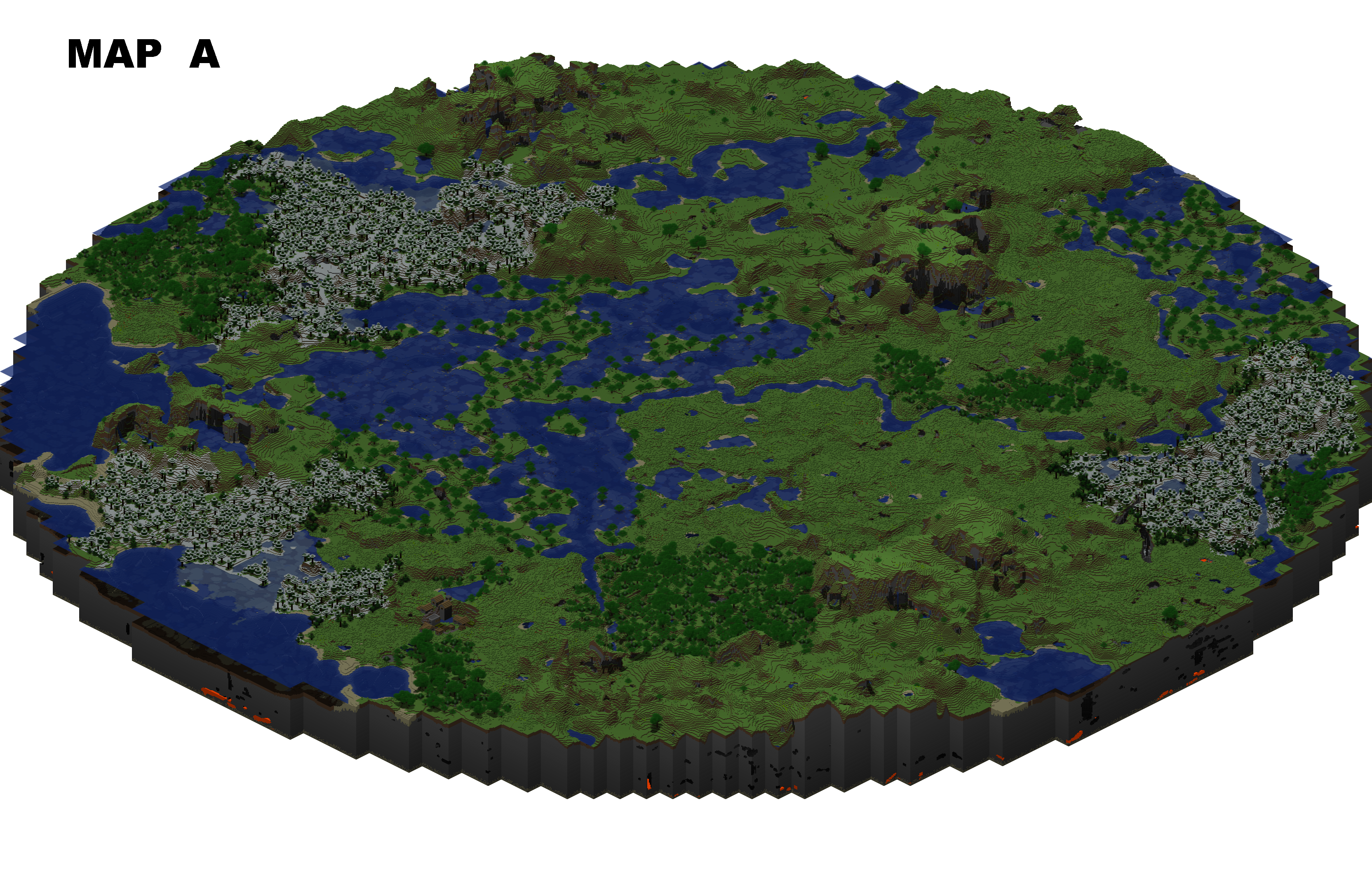 Here are the 3 maps to vote on for PVP.  I generated all three as admin, set world border to 375  450 blocks radius from world spawn.  Then filled and trimmed them into these disks you see before you.  The area 208 blocks from edge of map to world border is visible, but you cannot get there and only exists for aesthetics and to avoid visual artifacts when close to the edge of the map.